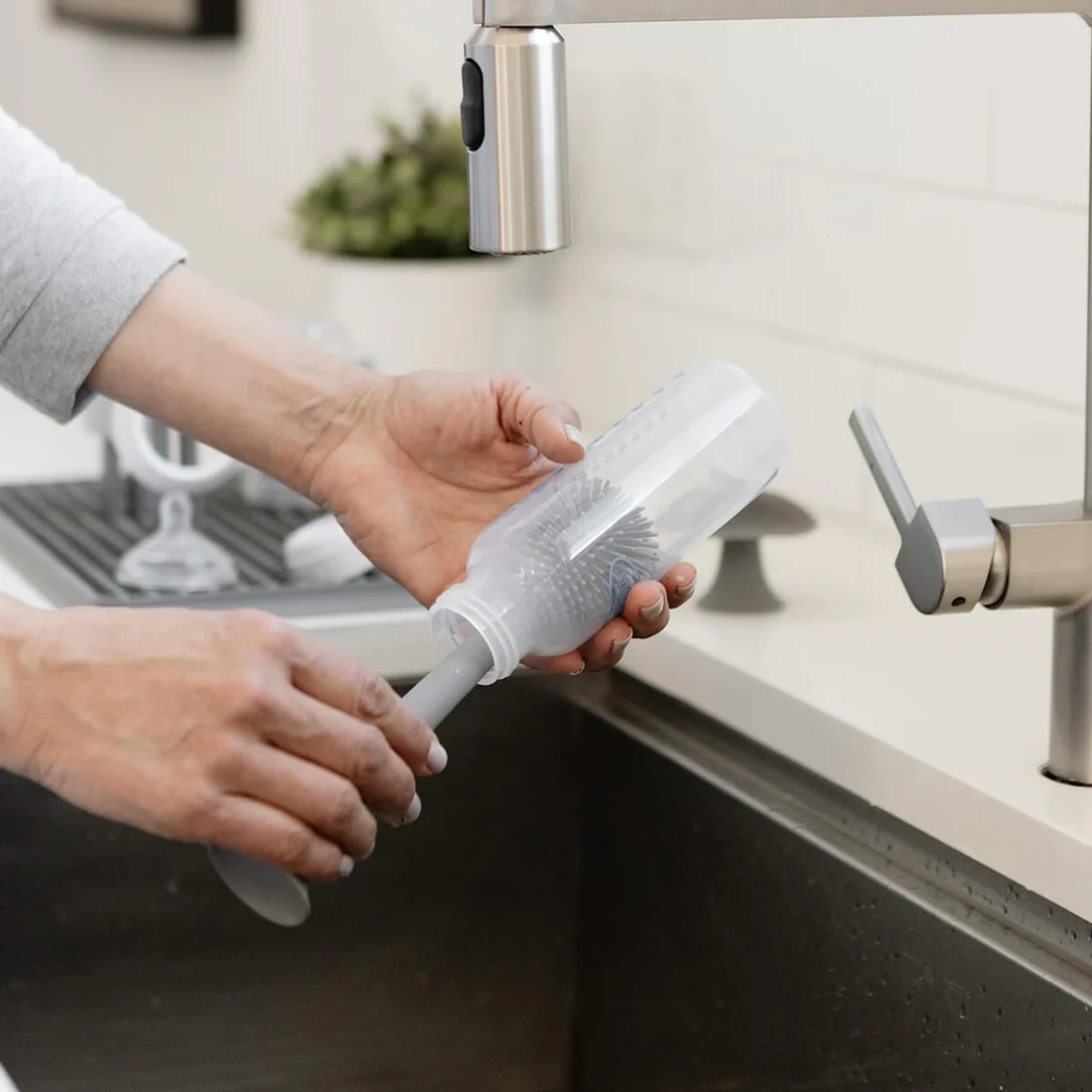 La brosse à biberons EzPz a été conçue pour nettoyer les biberons, les bouteilles d’eau, les tasses et les ustensiles de cuisine. Grâce à son matériau en silicone, elle est hypoallergénique, résistante aux odeurs et durable.