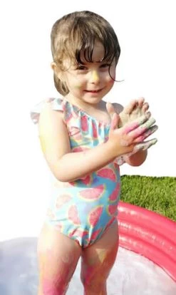 – Mode d’emploi: bien agiter et mettre un peu de peinture moussante dans des moules à glaçons. Utiliser un pinceau ou les doigts et peindre sur le corps. Savonner avec une débarbouillette ou avec les mains et rincer dans l’eau du bain
