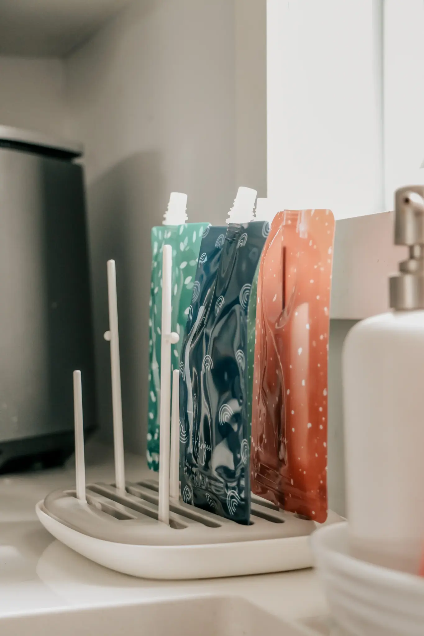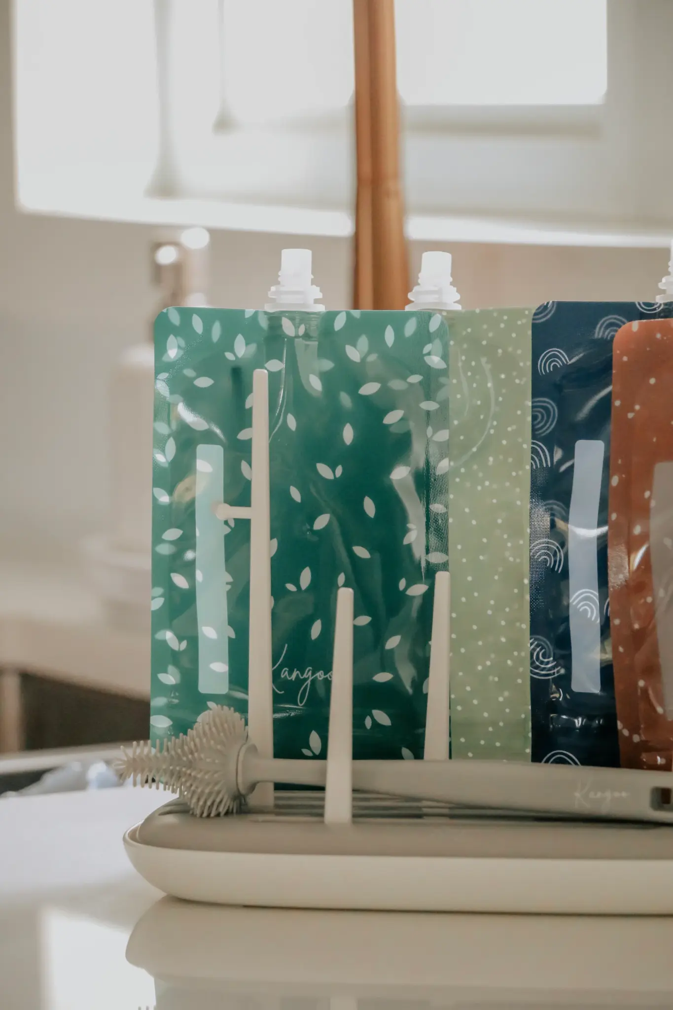 Ce joli égouttoir de couleur greige est idéal pour faire sécher vos pochettes alimentaires réutilisables, vos biberons, vos tétines pour biberon, vos bouteilles et autres accessoires. Muni d’un réservoir qui recueille l’excès d’eau, il permet de sécher efficacement, tout en gardant les comptoirs secs.
