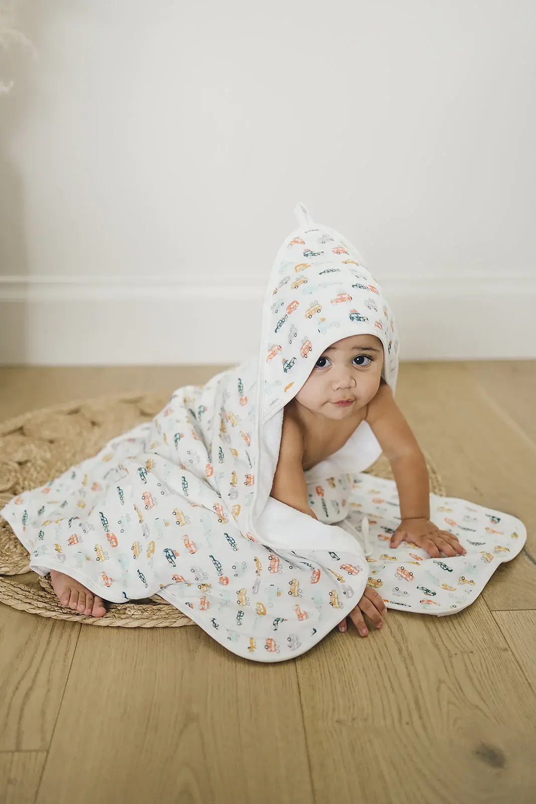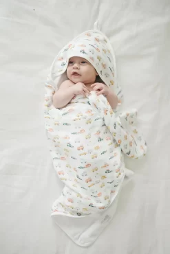 Ce joli ensemble comprenant une serviette à capuchon et une débarbouillette en mousseline de bamboo est la touche parfaite à la routine du bain de votre mini! La peau délicate de bébé appréciera la douceur et la capacité d’absorption incomparable de cet ensemble.