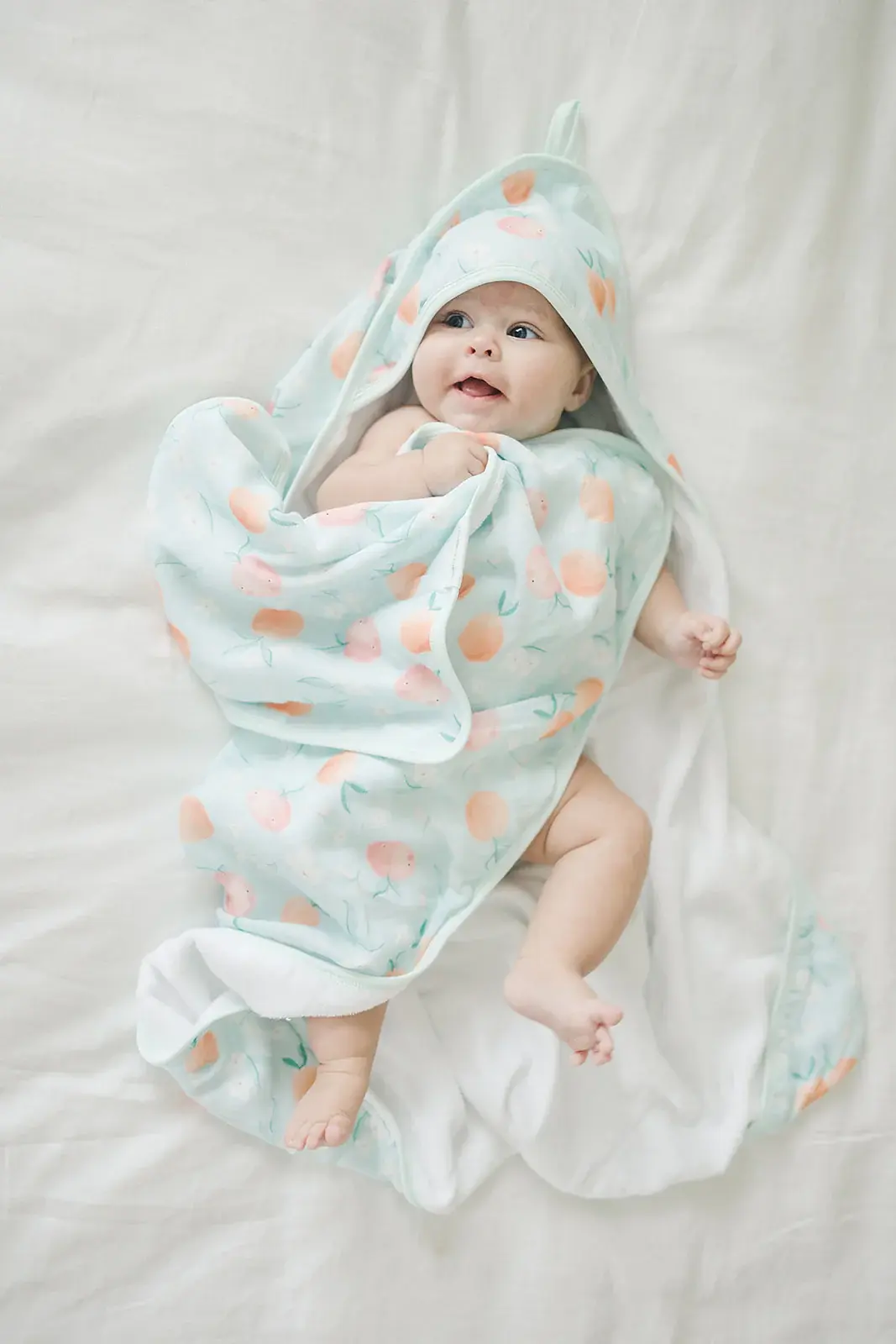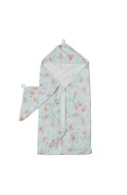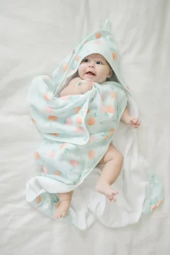 Ce joli ensemble comprenant une serviette à capuchon et une débarbouillette en mousseline de bamboo est la touche parfaite à la routine du bain de votre mini! La peau délicate de bébé appréciera la douceur et la capacité d’absorption incomparable de cet ensemble.