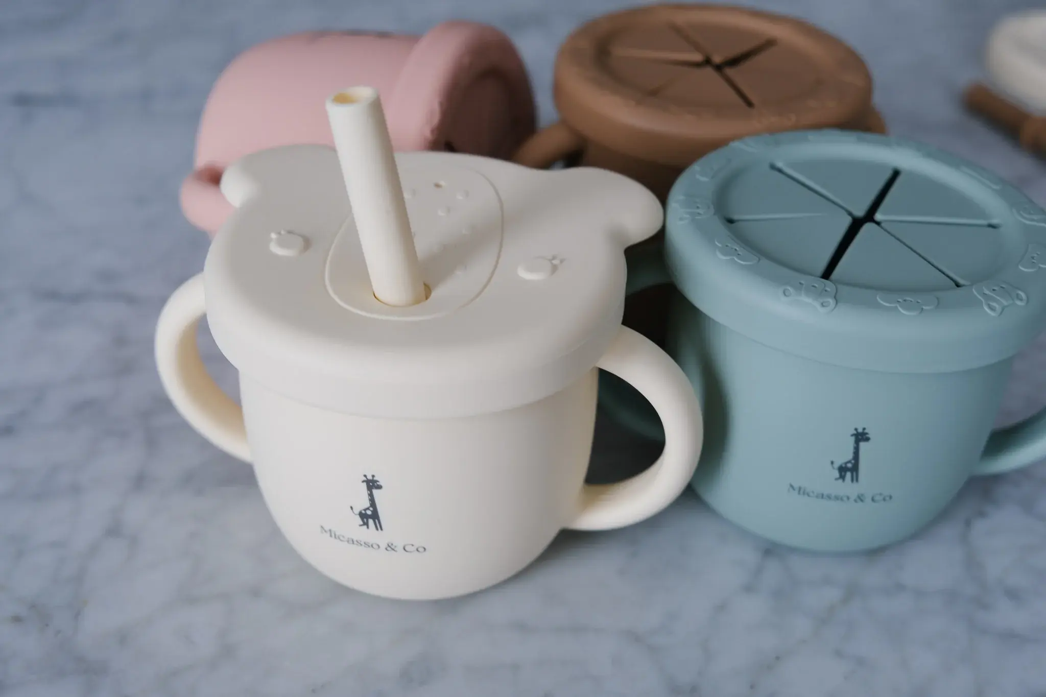 Très résistante, durable et jolie, la tasse d’apprentissage 2-en-1 en silicone de Micasso & Co propose 2 couvercles interchangeables, permettant d’y insérer du liquide ou une collation solide. Les couvercles amovibles possèdent des parois qui les rendent très solides et ne sont pas faciles à enlever pour les mains de votre tout-petit. Les collations demeurent dont sous contrôle!