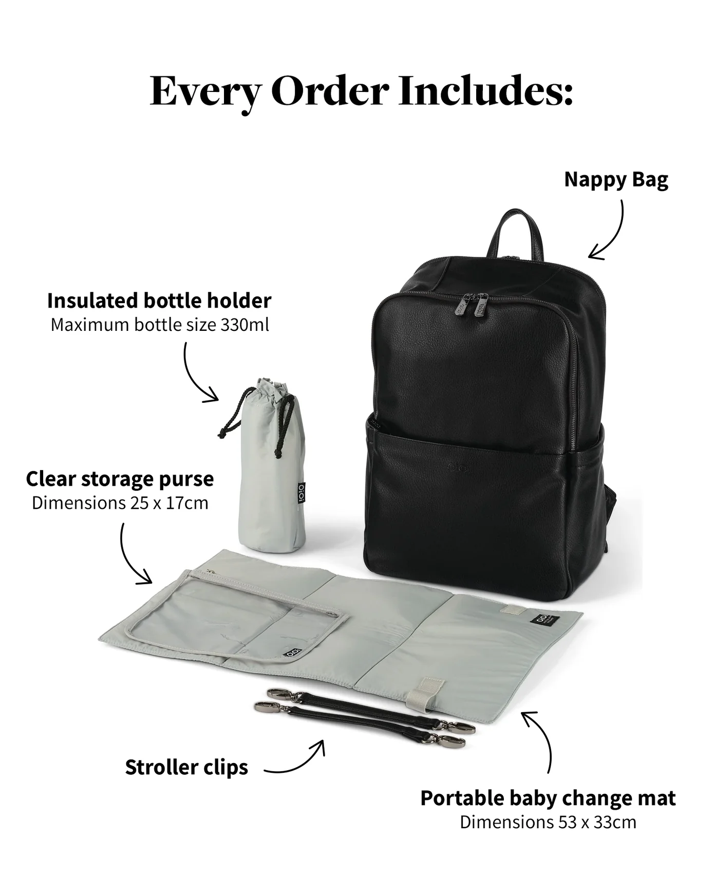 – Comprend: un grand tapis à langer rembourré et essuyable, un porte-bouteille isotherme, un sac transparent à fermeture éclair et deux sangles pour poussette