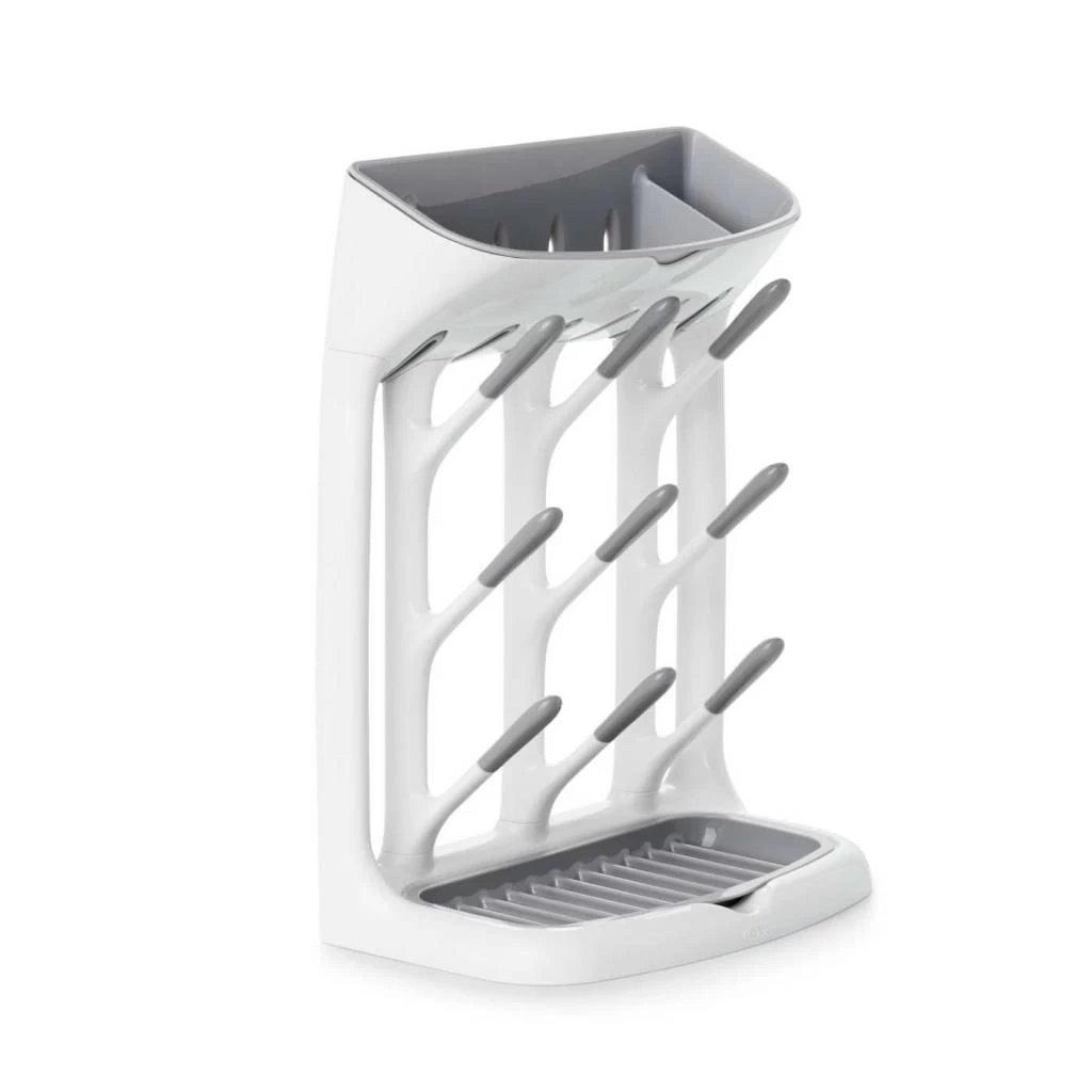 De sa conception compacte, le support de séchage peut contenir les gobelets, les bouteilles et toutes leurs pièces sans encombrer le comptoir. Les piquets inclinés maintiennent les tasses et les bouteilles au bon angle pour un séchage optimal, tandis que le haut et la base sont parfaits pour sécher de petites pièces telles que des valves ou des suces.